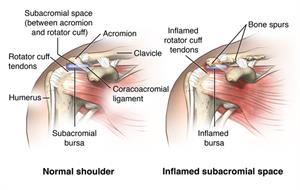 Front view of shoulder showing bones, ligaments, tendons, and bursa.
