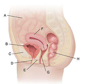 Cross section of female pelvis from the side showing pelvic organs.