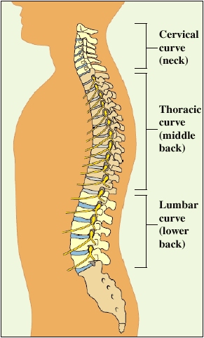 The spine has three natural curves: the cervical, the thoracic, and the lumbar.
